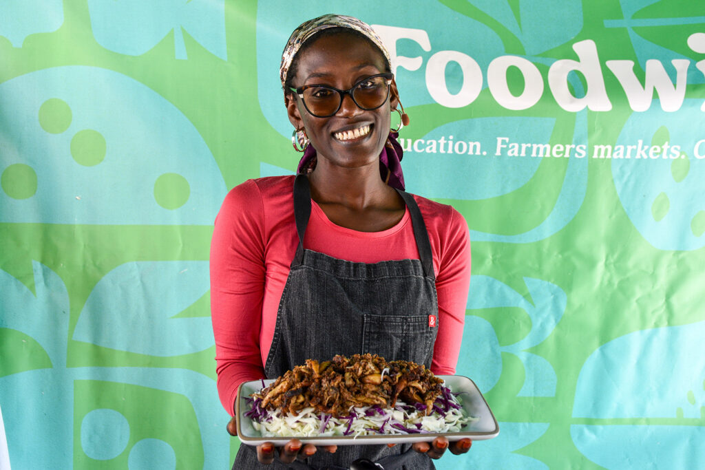 Oven-Roasted Chicken & Sweet Potato Mash from Mo’Raysha Pouoa, founder of Mo’Raysha’s. Pouoa grew up eating her mother’s Southern-style cooking, as exemplified in this flavorful chicken with Cajun seasoning and fresh herbs paired with creamy sweet potatoes, demonstrated at the Foodwise Classroom. In 2019, she turned her love for food into a catering business, initially selling food in her local community. She continues to grow her business with the support of SF Black Wealth. Visit Mo’Raysha’s at the Ferry Plaza on Tuesdays and Thursdays.
