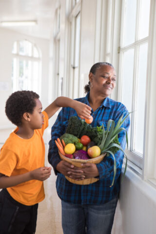 Angela Barker and her grandson, Lloyd, have improved their health by stocking up on fresh foods at the community produce stand at Highland Hospital in Oakland, California. Angela Barker was a participant and mentor in the innovative Bite-to-Balance program at Highland Hospital. The program, which was run by the nonprofit Mandela Partners, combined healthy food access, nutrition education, and cooking classes to combat the effects of adult and pediatric diet-related disease. Mandela Partners also enrolled patients in FreshCreds, which continues to provide a 50% discount on fruits and vegetables at local corner stores and community produce stands throughout Oakland. Since the program ended, Angela continues to be a weekly customer and fruit and vegetable champion at the Mandela Partners produce stand at her grandson’s school.