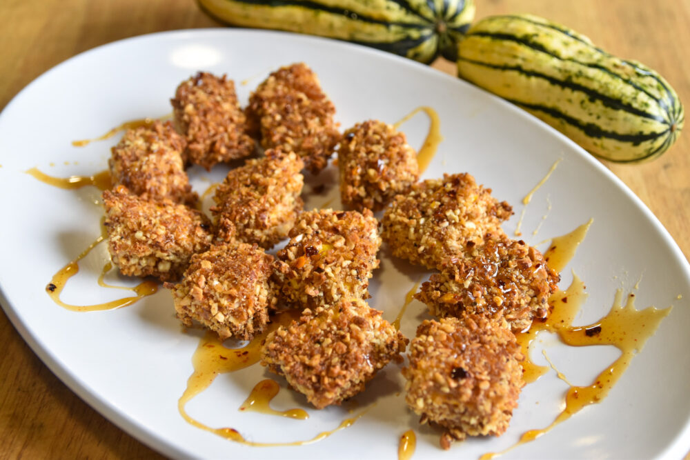 - Dip each piece of squash into the flax egg, letting any excess drip off. Then coat the pieces in the almond mixture, pressing firmly so it adheres well.