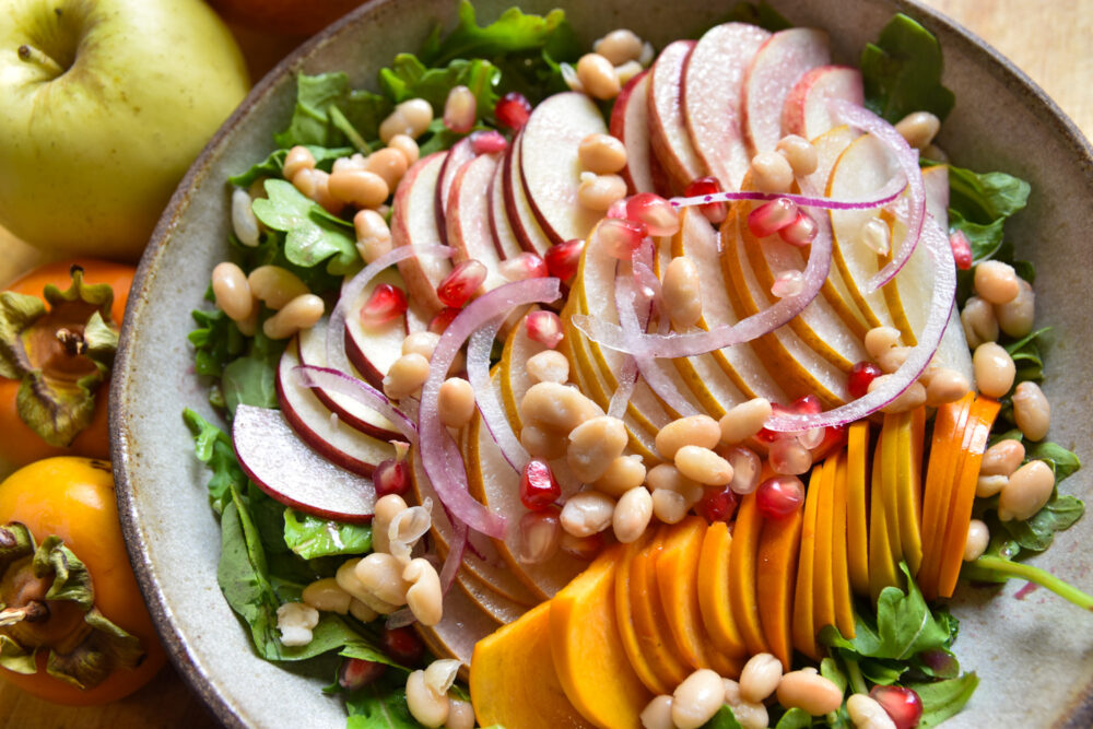 Now that fall fruits are starting to appear in the market, but summer lingers in the Bay Area, we love keeping things fresh with cold salads. This one combines crisp fall fruits with creamy beans and peppery arugula, all dressed in tangy pomegranate dressing.