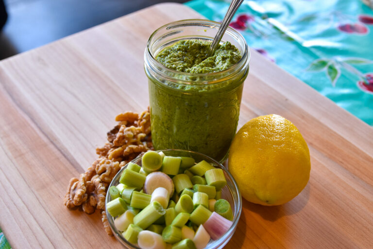 Besides this delicious take on pesto, green garlic can be used in soups, sauces, and stir-fries, anywhere you would use mature garlic. To preserve freshness, cover any unused portion of pesto with a thin layer of olive oil and refrigerate for up to a week.